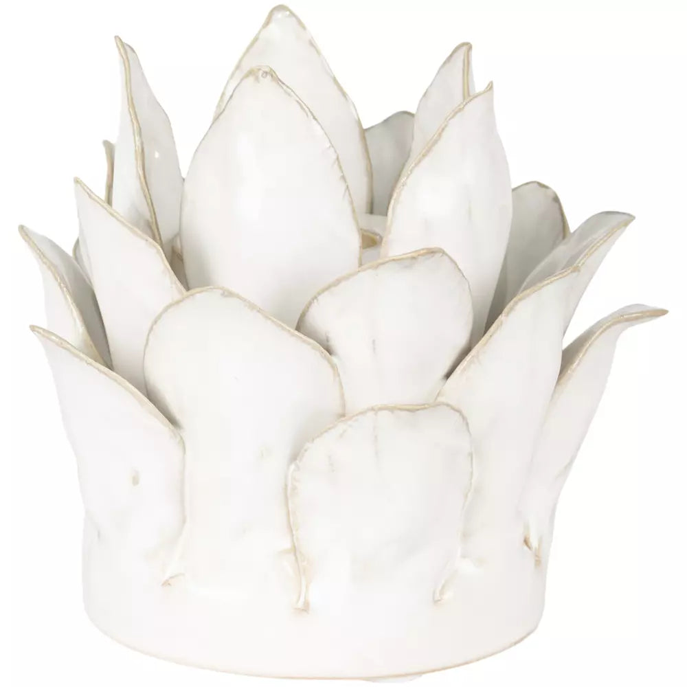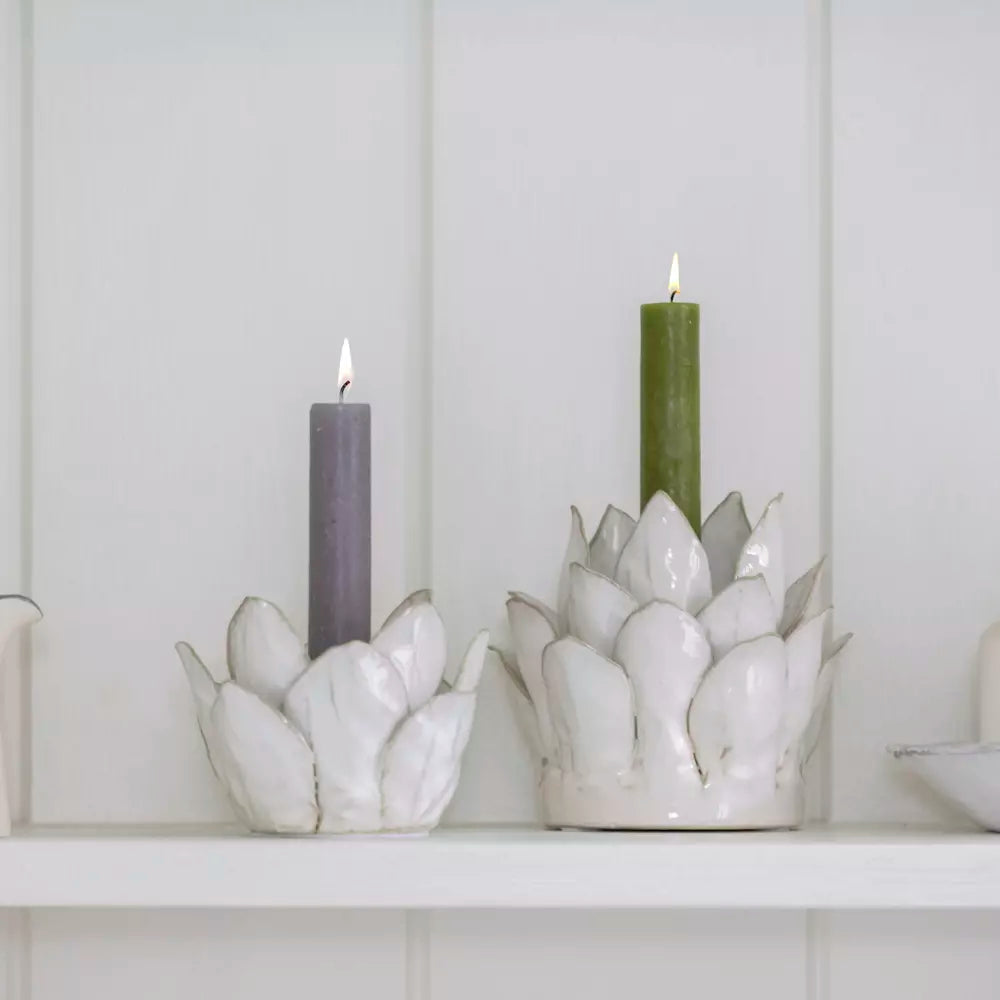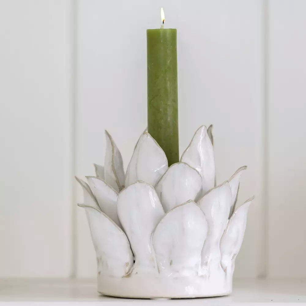 Elevate your home décor with this charming medium ceramic candle holder, featuring petal detailing in a soft white finish. The distressed surface adds rustic character and vintage appeal, creating a warm, inviting atmosphere in any room. Candle not included.