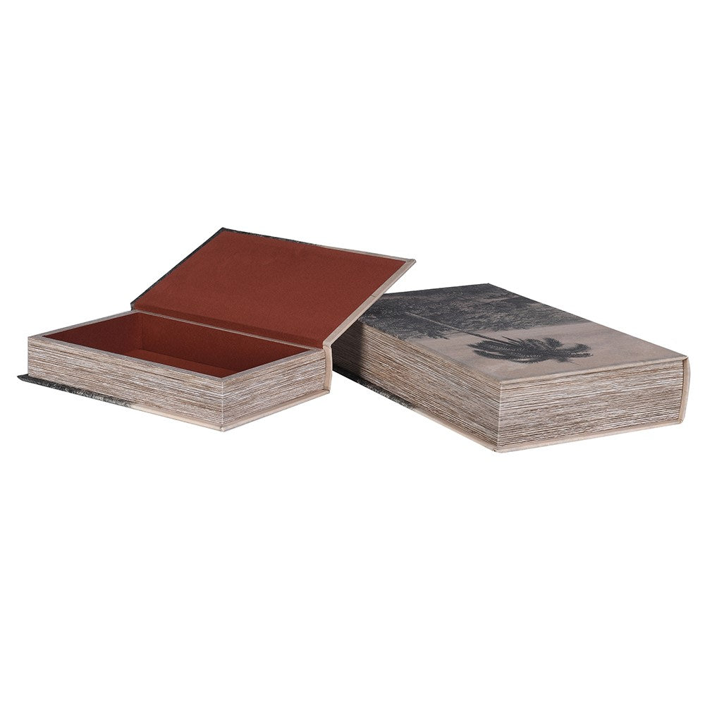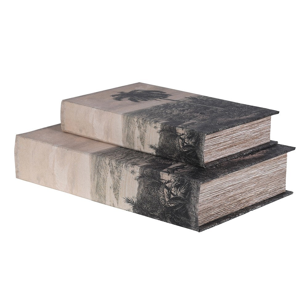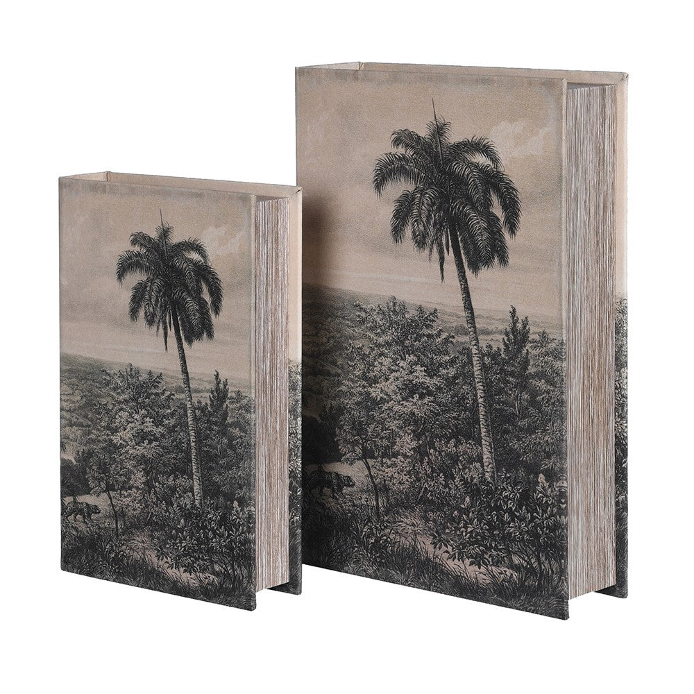Organize your shelves with these elegant muted palm tree book boxes. This set of two decorative storage boxes combines natural botanical design with practical functionality, perfect for concealing clutter while adding a touch of understated style to any room.