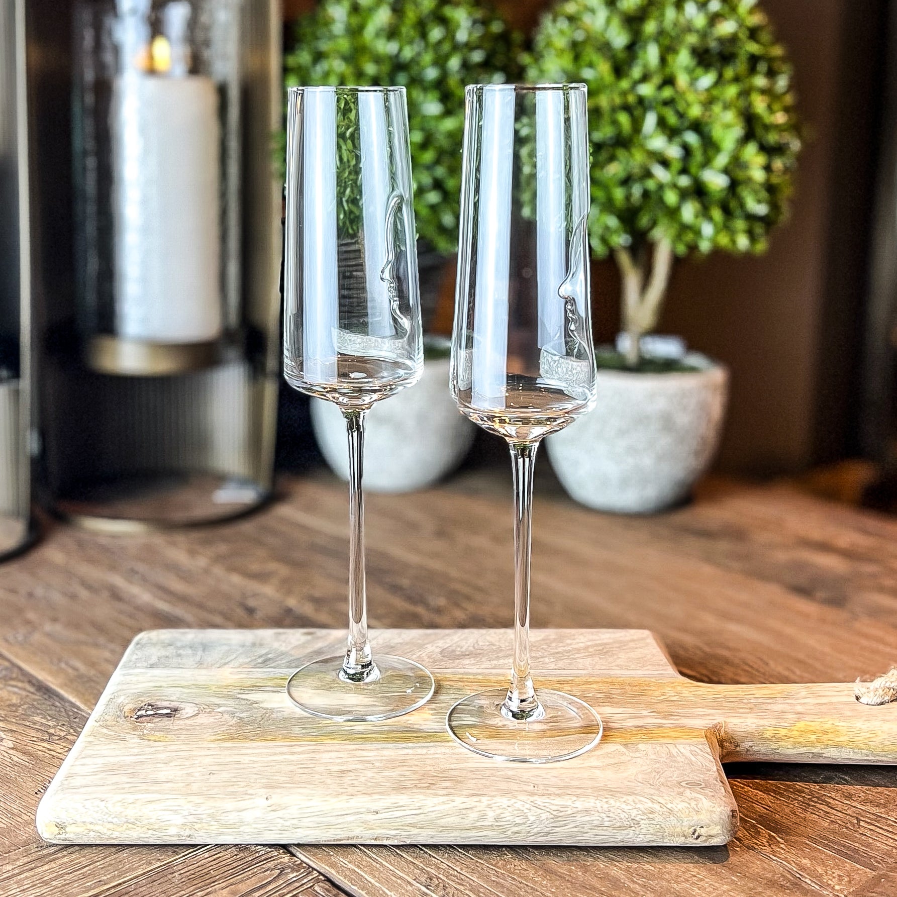 This unique champagne flute features a face silhouette cut out positioned in the side of the glass, with a silver hand painted edge.