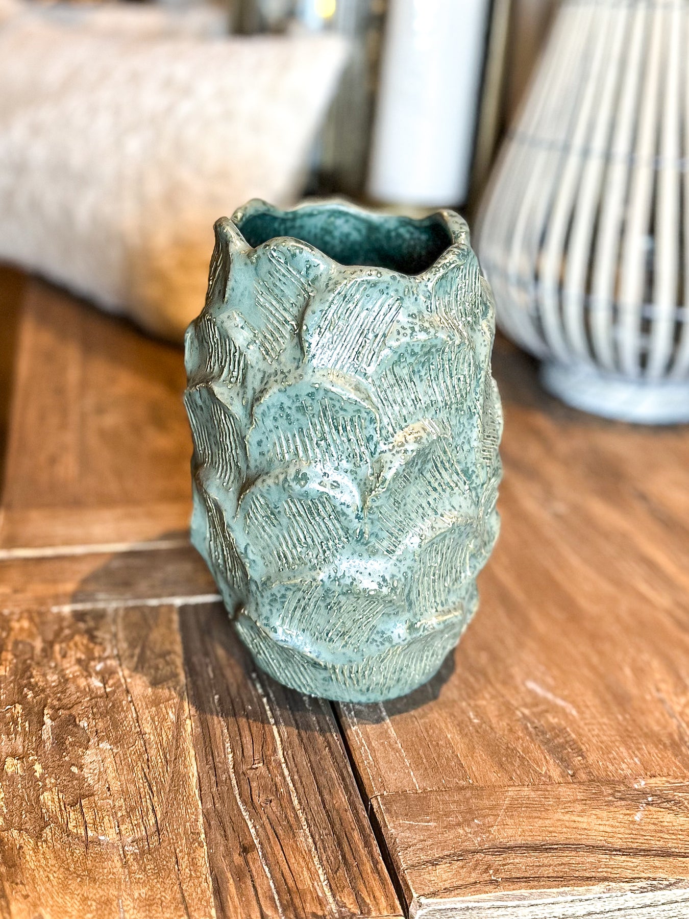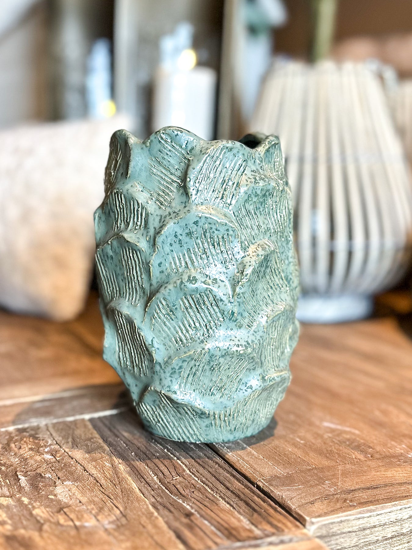 This elegant 21cm vase showcases a sophisticated leaf pattern in rich green tones, making it an ideal focal point for any interior space.