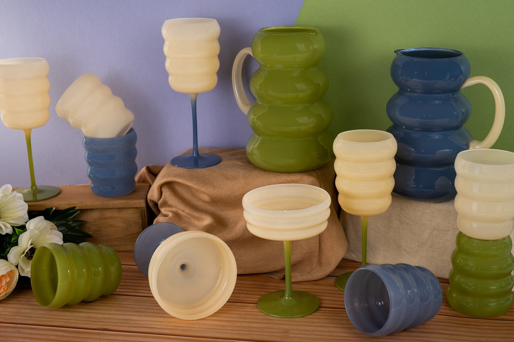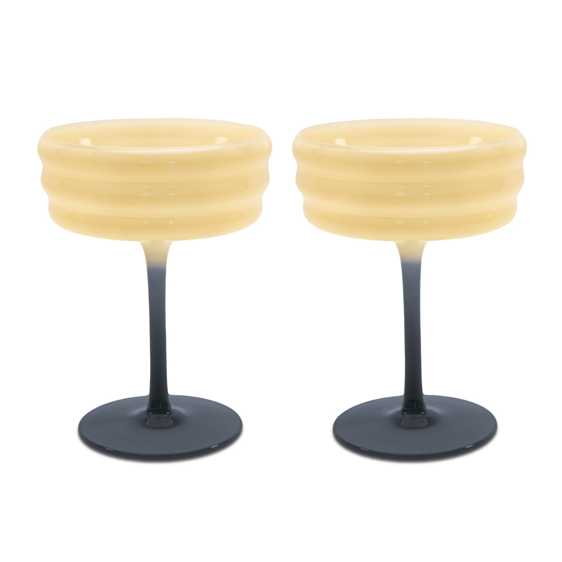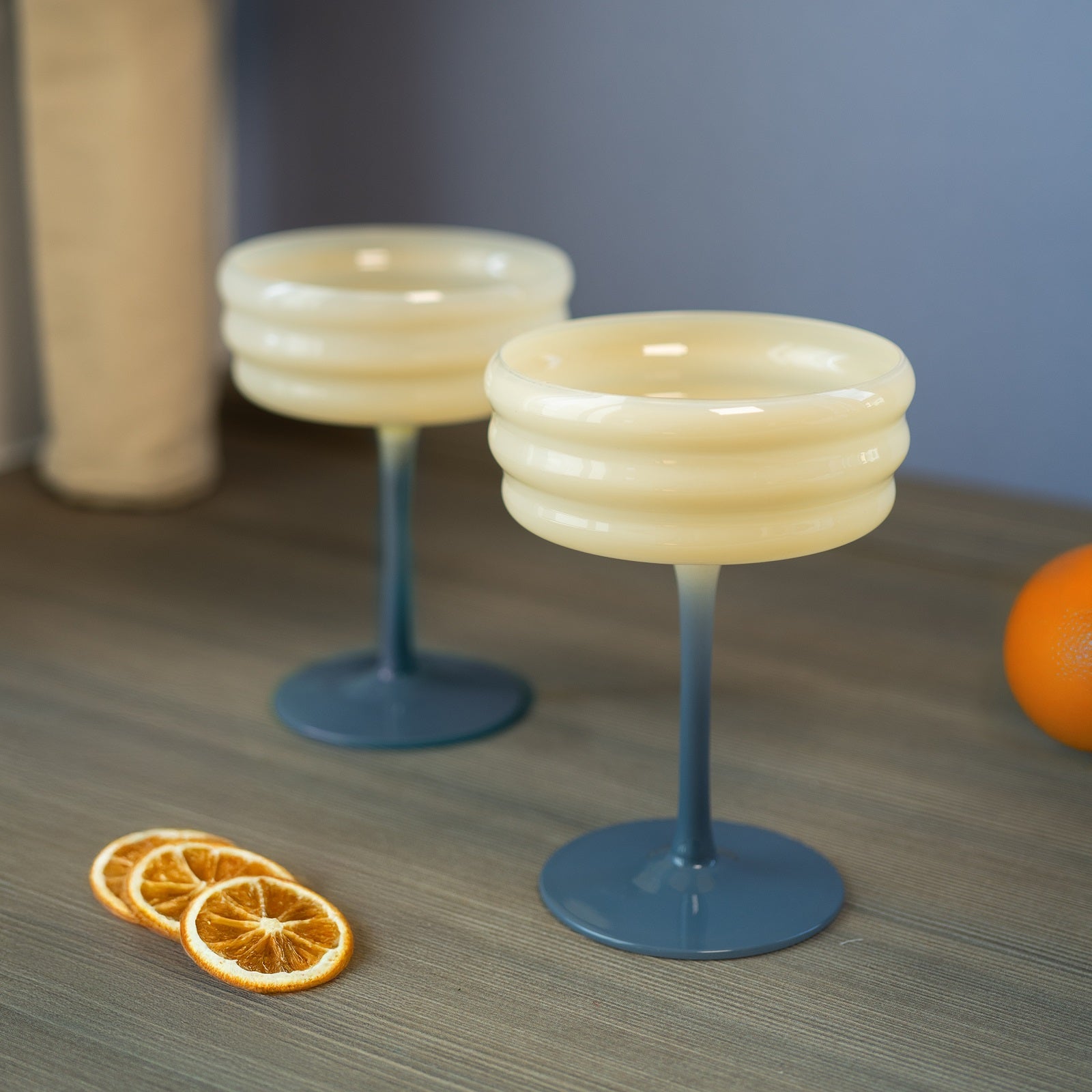 These White & Blue Ribbed Coupe Glasses offer a refined blend of classic design and distinctive style. Crafted with subtle ribbed detailing, their coupe shape enhances the presentation of cocktails and sparkling wines, promoting an even distribution of aromas.