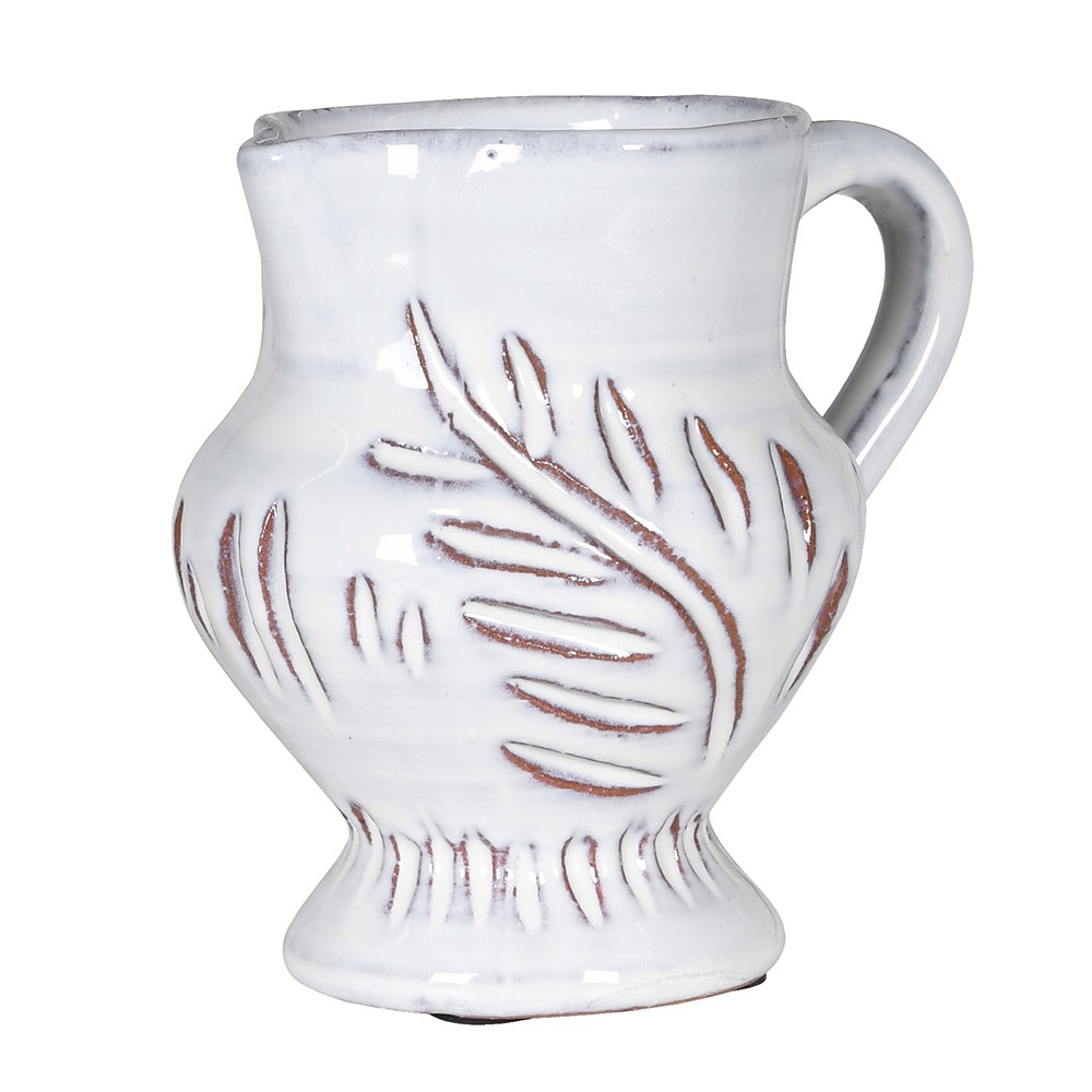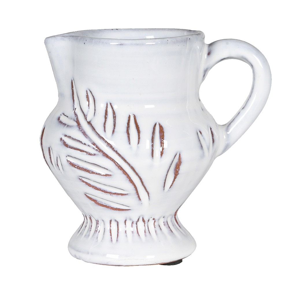 This White Glazed Leaf Etched Jug combines delicate craftsmanship with elegant design. Featuring a white glaze, the jug is elegantly etched with a refined leaf pattern, adding subtle texture and sophistication.