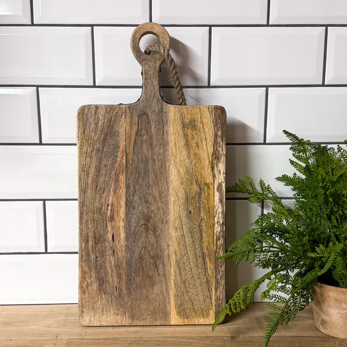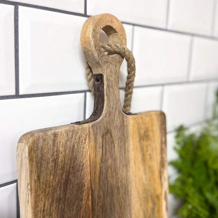 This elongated mango wood board combines natural beauty with practical functionality. The warm grain patterns of mango wood provide an elegant serving surface, whilst integrated metal detailing adds contemporary sophistication and durability.