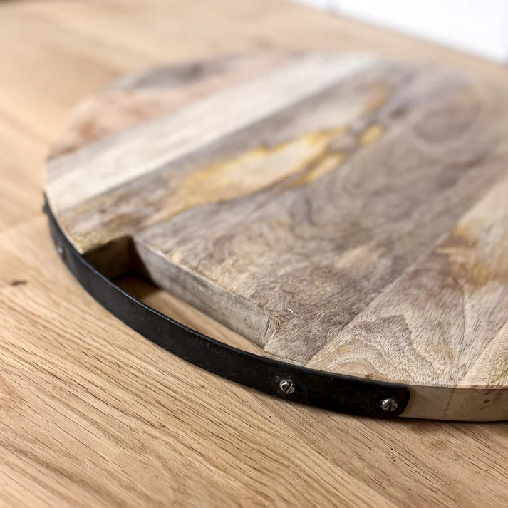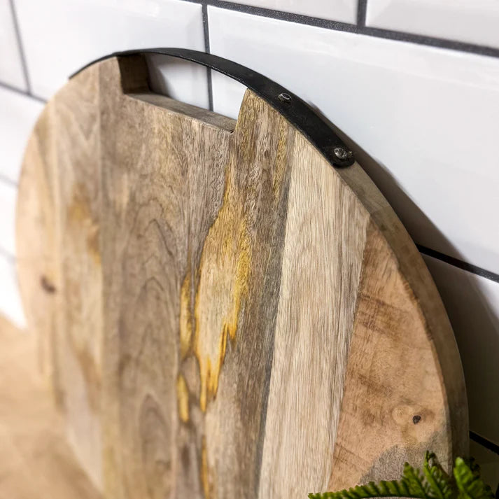 Crafted from premium mango wood, this round serving board combines natural beauty with practical functionality. The distinctive metal detailing adds contemporary elegance, making it equally suited for food presentation or kitchen display.