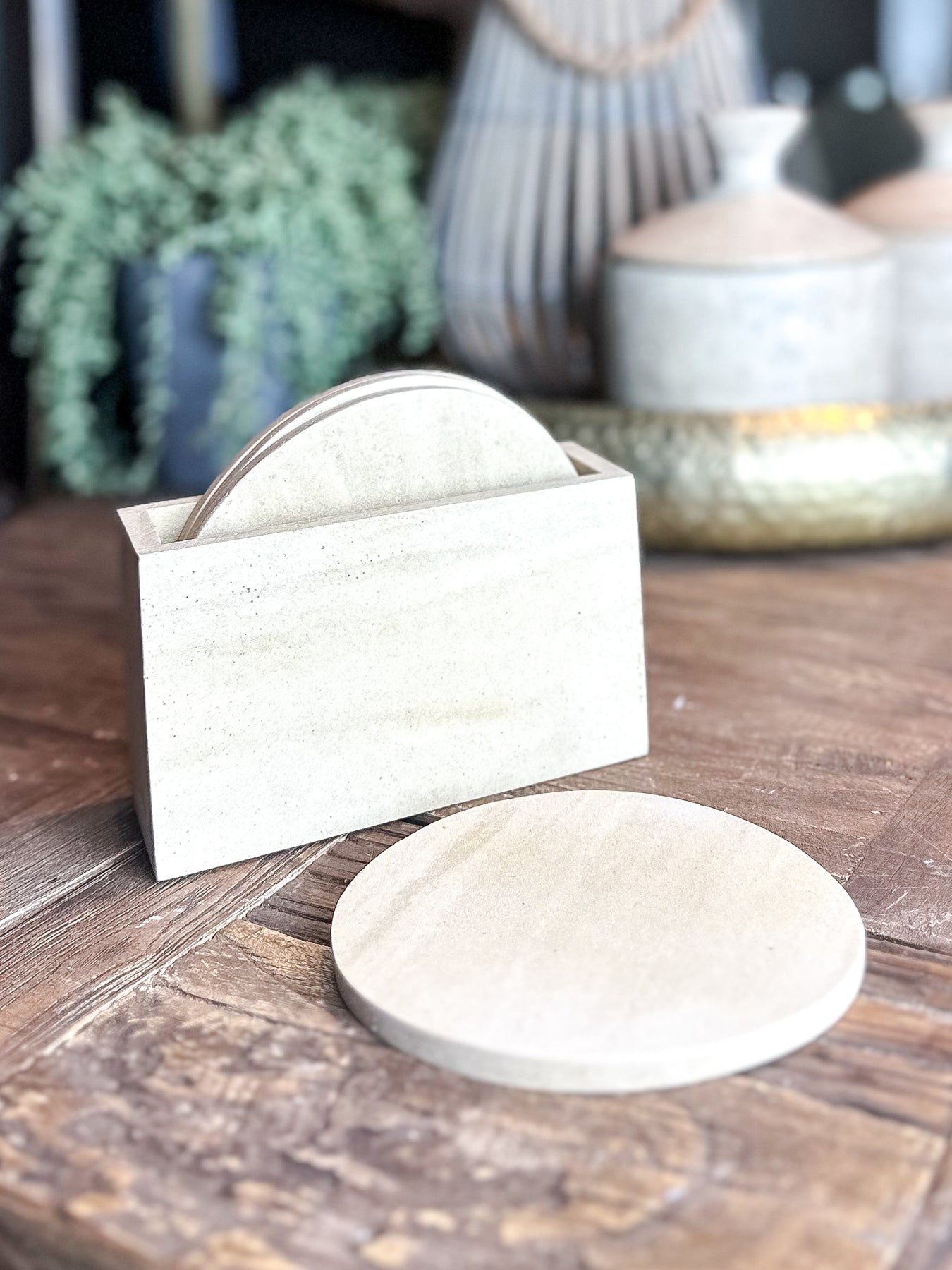 Protect your surfaces in style with this set of four travertine effect coasters. Crafted to mimic the natural beauty of travertine stone, each coaster features a warm beige finish that complements any interior aesthetic.