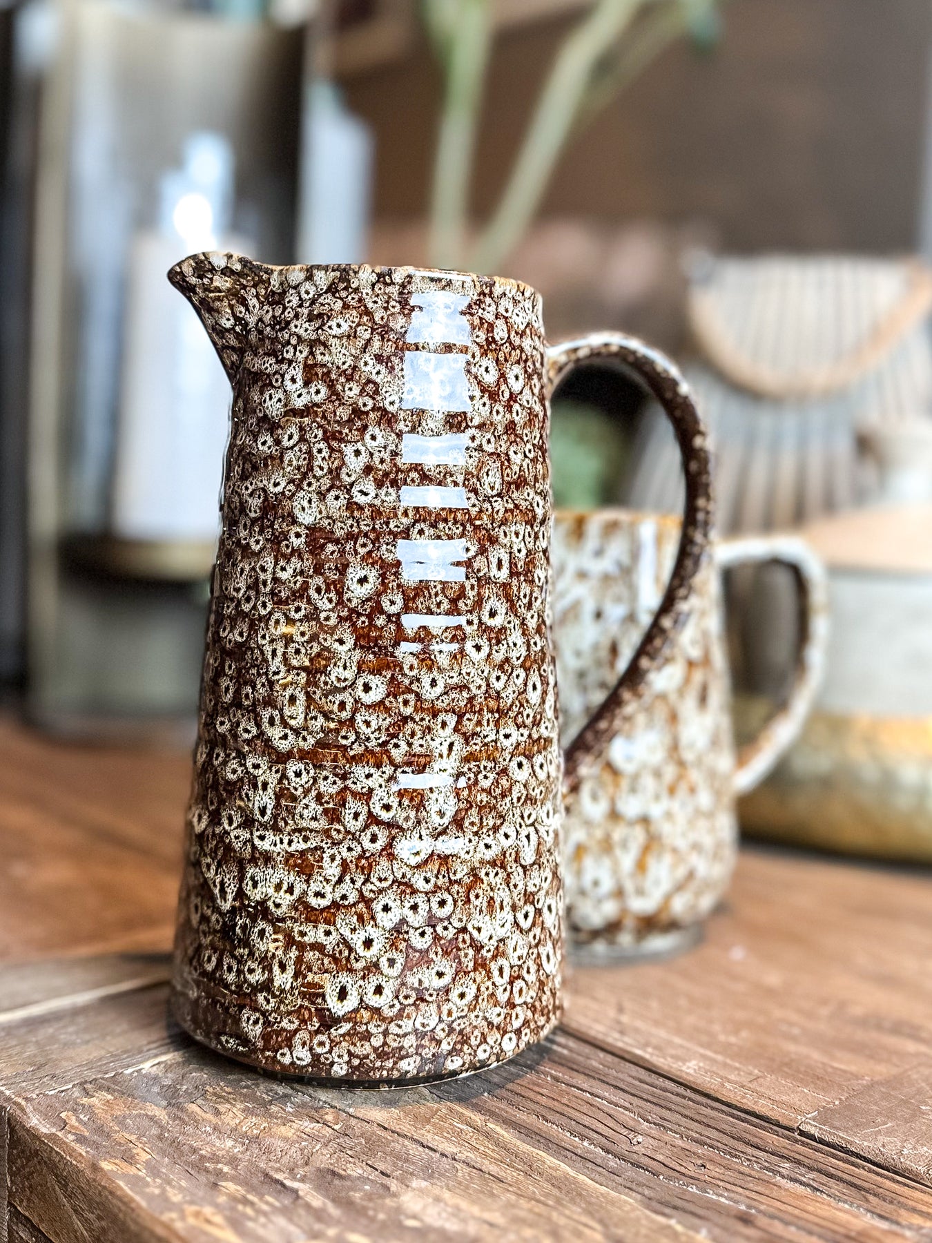 This handcrafted ceramic jug showcases a distinctive speckled brown glaze. Each piece features unique surface variations, a hallmark of artisanal pottery where no two glazes are identical.