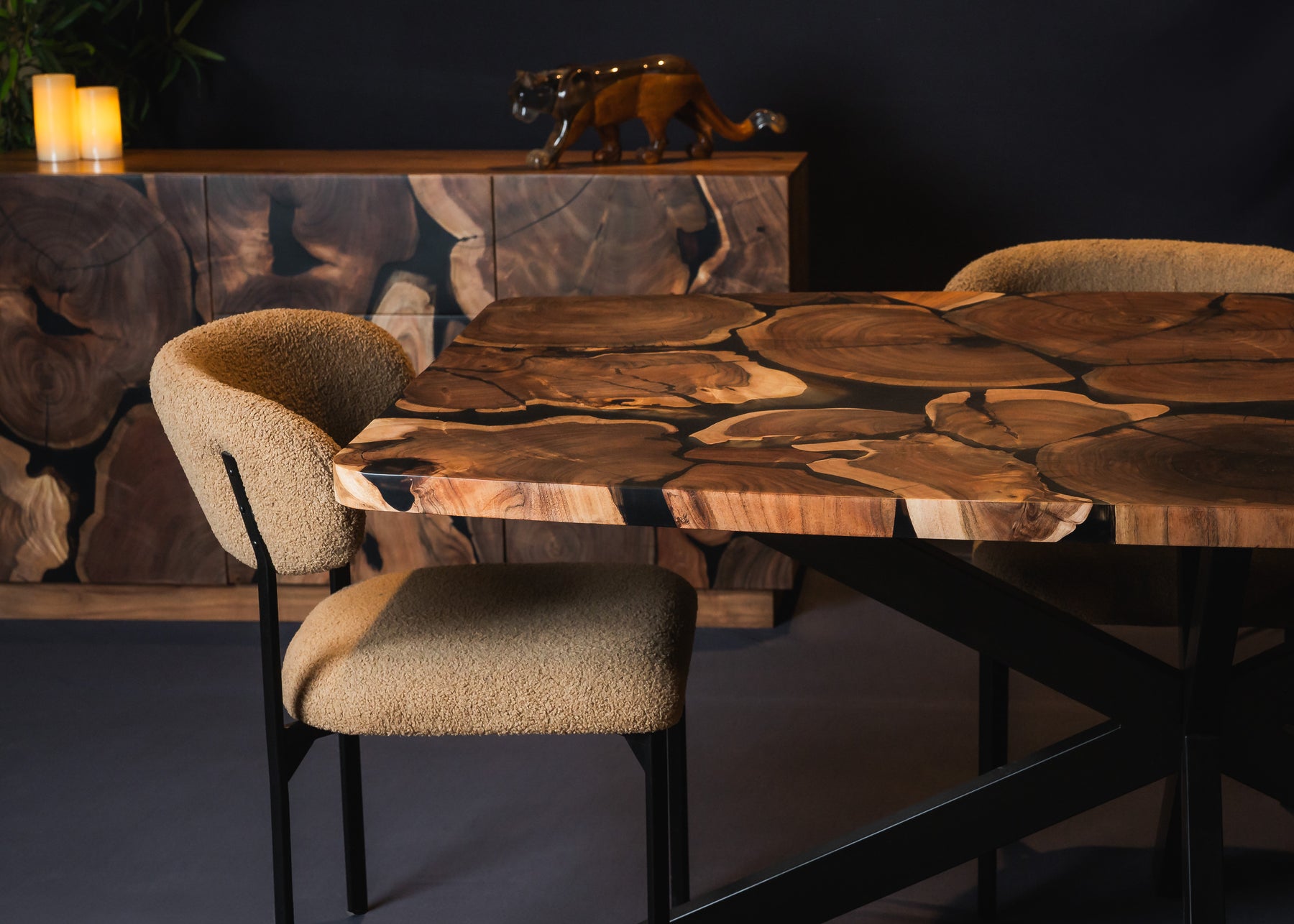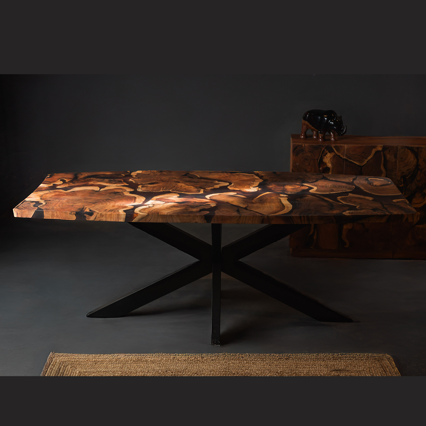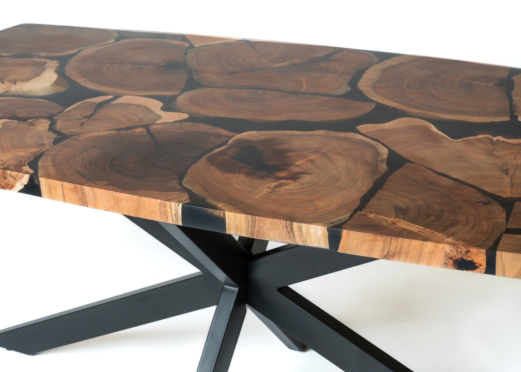 Handcrafted from natural acacia wood trunks and finished with premium epoxy resin, this dining table showcases the organic beauty of each grain pattern and colour variation. The matte black metal cross-leg base provides contemporary contrast and exceptional stability. Every piece is entirely unique, making this a distinctive statement for discerning interiors. The resin finish ensures durability and easy maintenance whilst preserving the wood's authentic character.