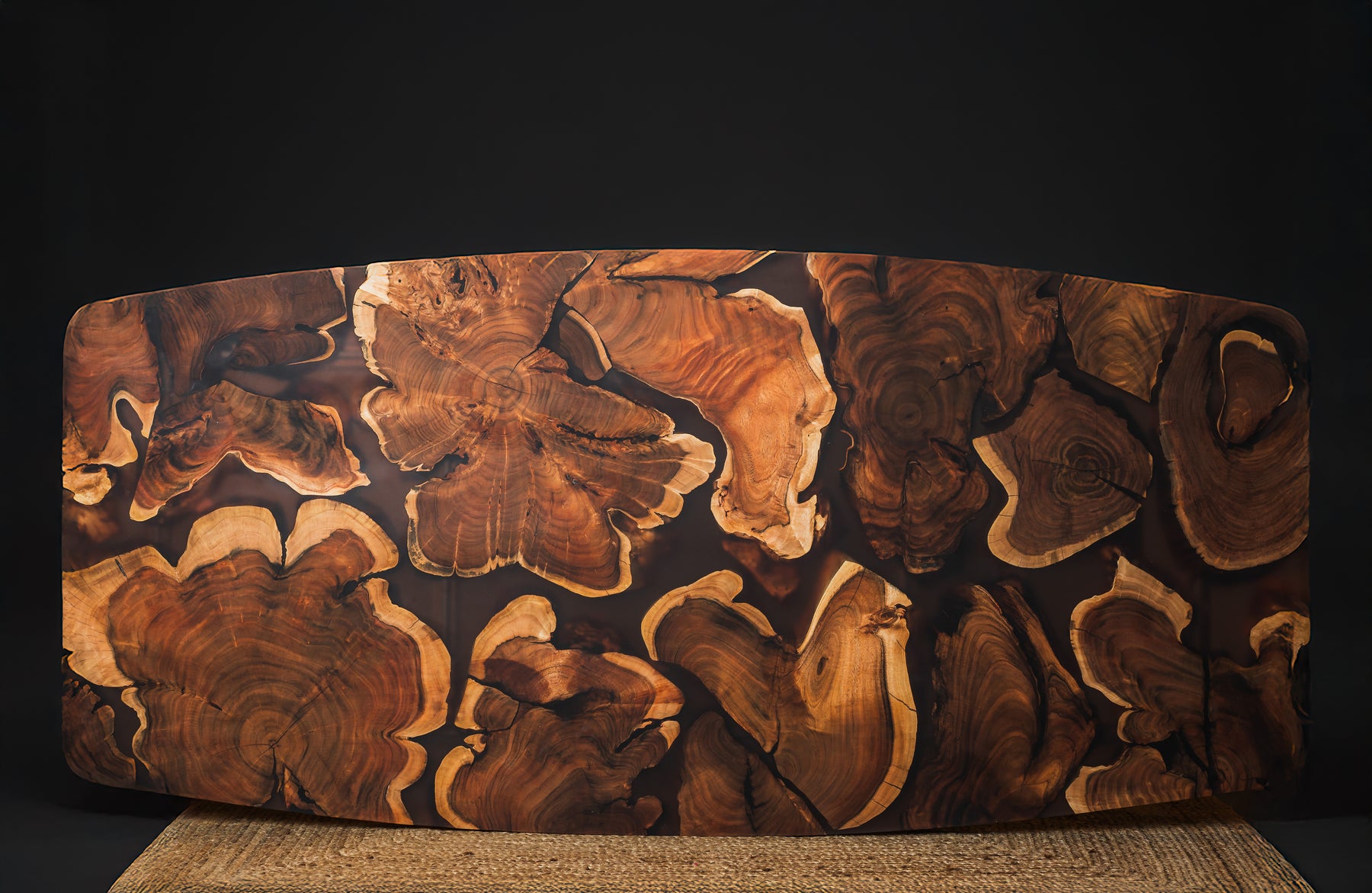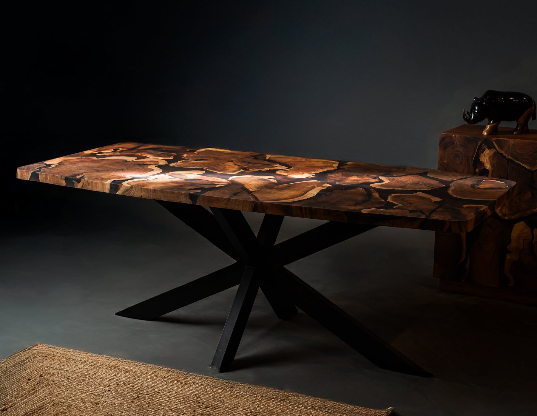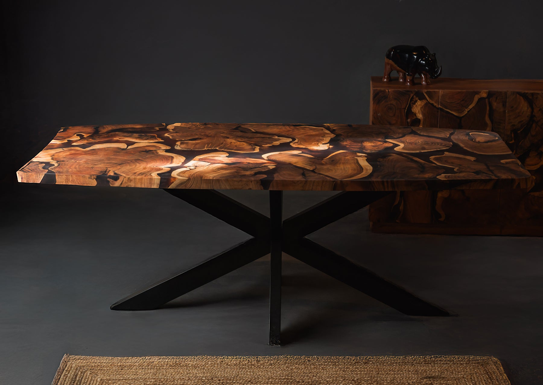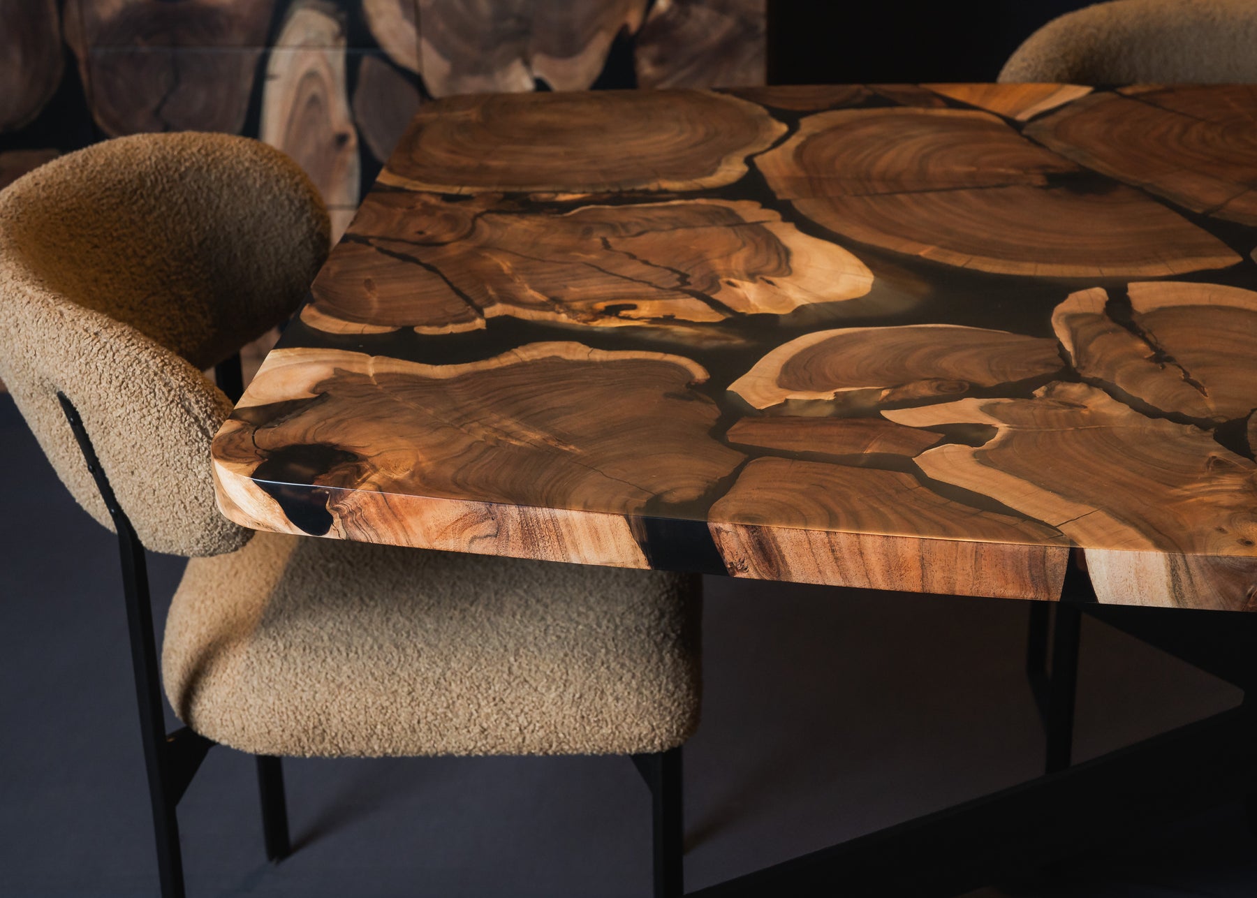 Handcrafted from natural acacia wood trunks and finished with premium epoxy resin, this dining table showcases the organic beauty of each grain pattern and colour variation. The matte black metal cross-leg base provides contemporary contrast and exceptional stability. Every piece is entirely unique, making this a distinctive statement for discerning interiors. The resin finish ensures durability and easy maintenance whilst preserving the wood's authentic character.