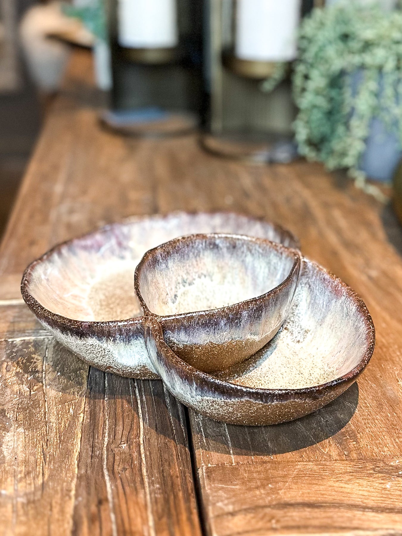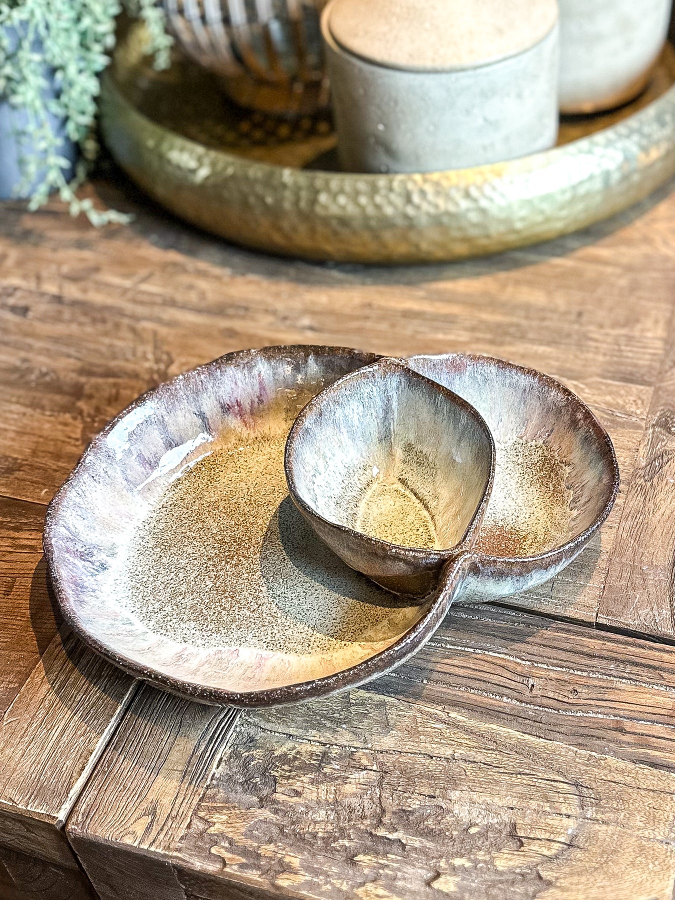 The Brown Ombre Glazed Sectioned Bowl offers a sophisticated way to serve. Its carefully designed compartments help keep ingredients separate, ideal for appetizers, dips, or snacks. The ombre glazing adds an elegant, artisanal touch, enhancing both presentation and durability.