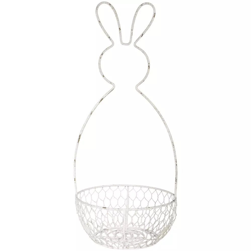 Elevate your Easter displays with this charming distressed white wire bunny basket. Handcrafted with a rustic aesthetic, its weathered finish adds authentic vintage character to seasonal décor. Please note, the blue ribbon is not included.