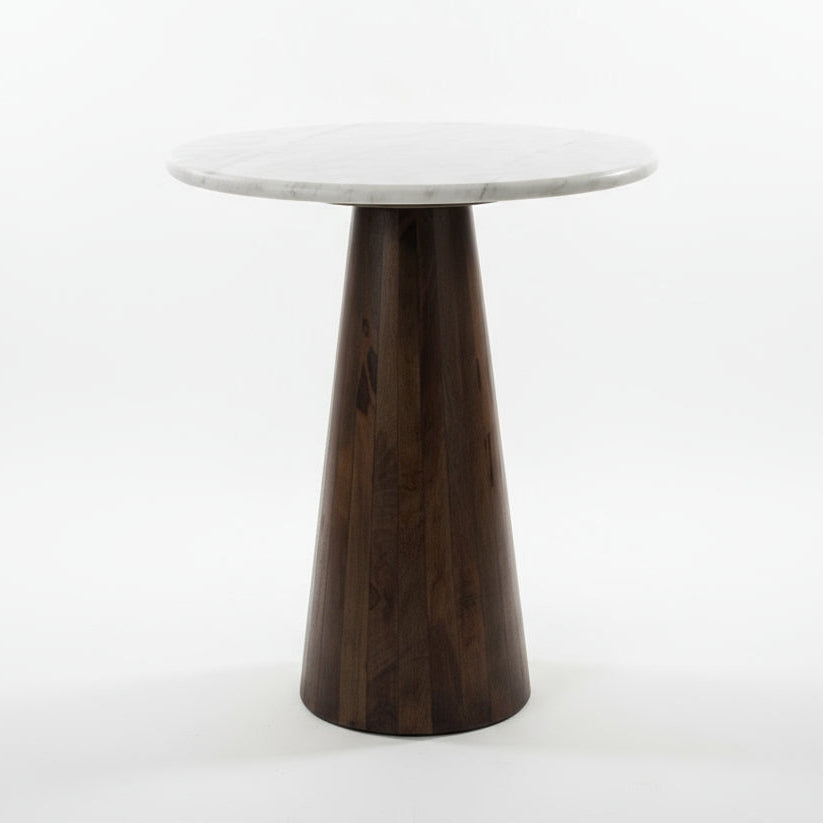 The Tola Side Table combines form and function with its distinctive sculptural design. A solid mango wood cone base provides sturdy support while serving as a visual statement piece, complemented by a smooth marble tabletop that's both practical and elegant. Its compact footprint makes it ideal for tight spaces, yet the striking silhouette ensures it commands attention as a standalone accent.