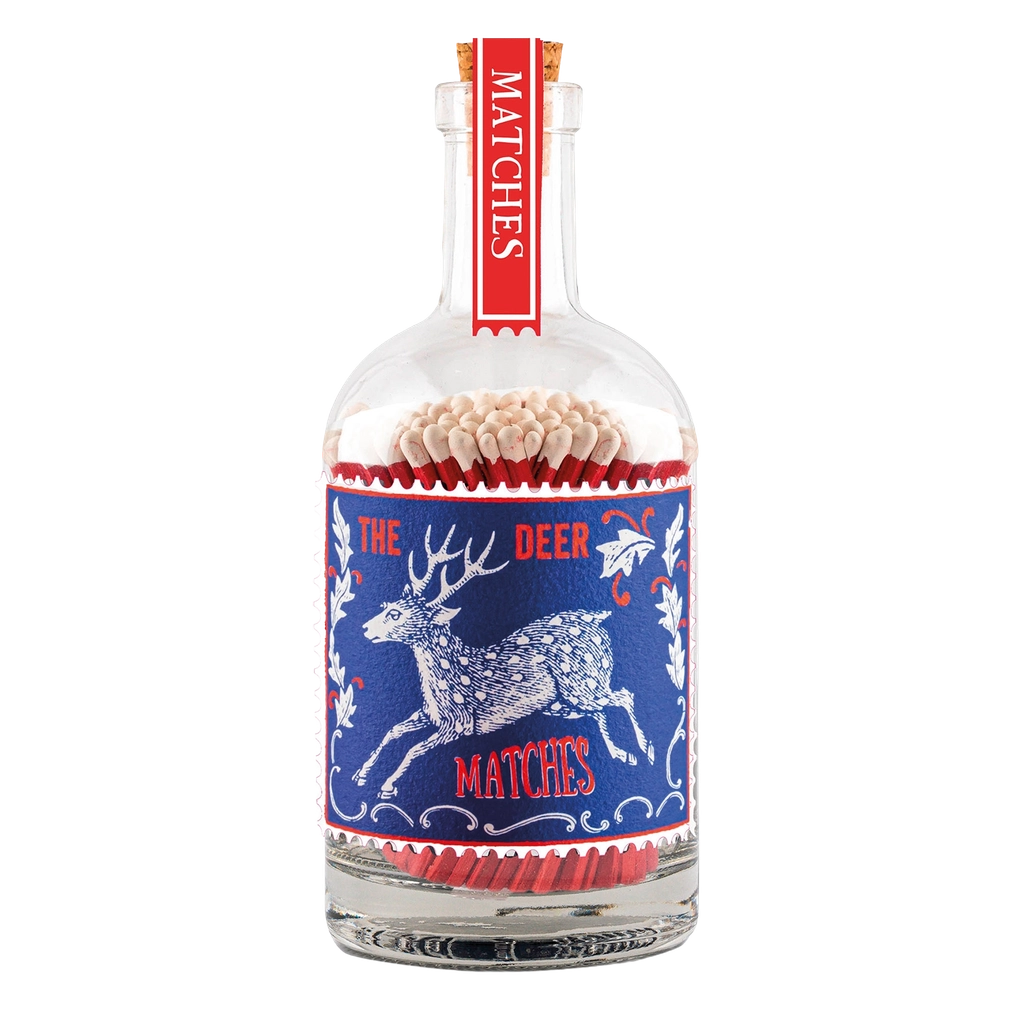 'The Stag' Stamp Glass Bottle Matches offer 125 carefully crafted matches housed in a sleek glass container, ideal for both practical use and stylish gifting. Their sturdy, long-burning heads ensure reliable ignition every time, making them perfect for lighting candles, fireplaces, or campfires. Presented in an elegant bottle, they add a refined touch to any setting while providing a dependable flame when you need it most.