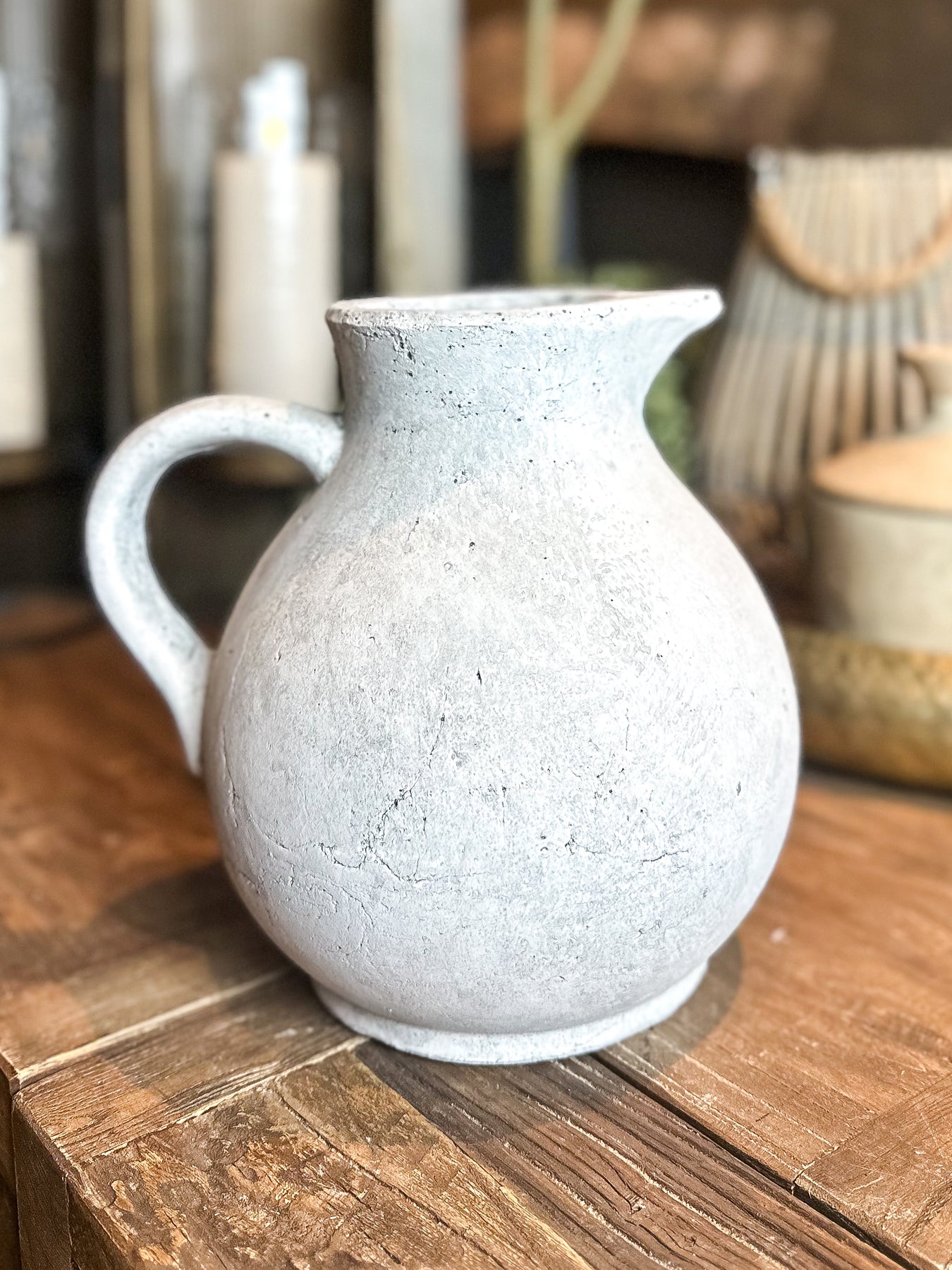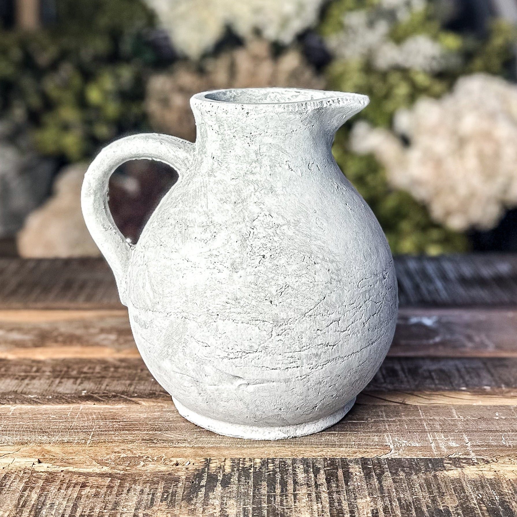 The Grey Stoneware Jug timeless charm with its distressed grey finish and elegant curves. Made from sturdy concrete, this Athena jug serves as a versatile statement piece, ideal for displaying fresh florals wrapped in florist paper or as standalone decor. Its refined design complements both rustic and modern interior styles, adding subtle sophistication and durability to any space.