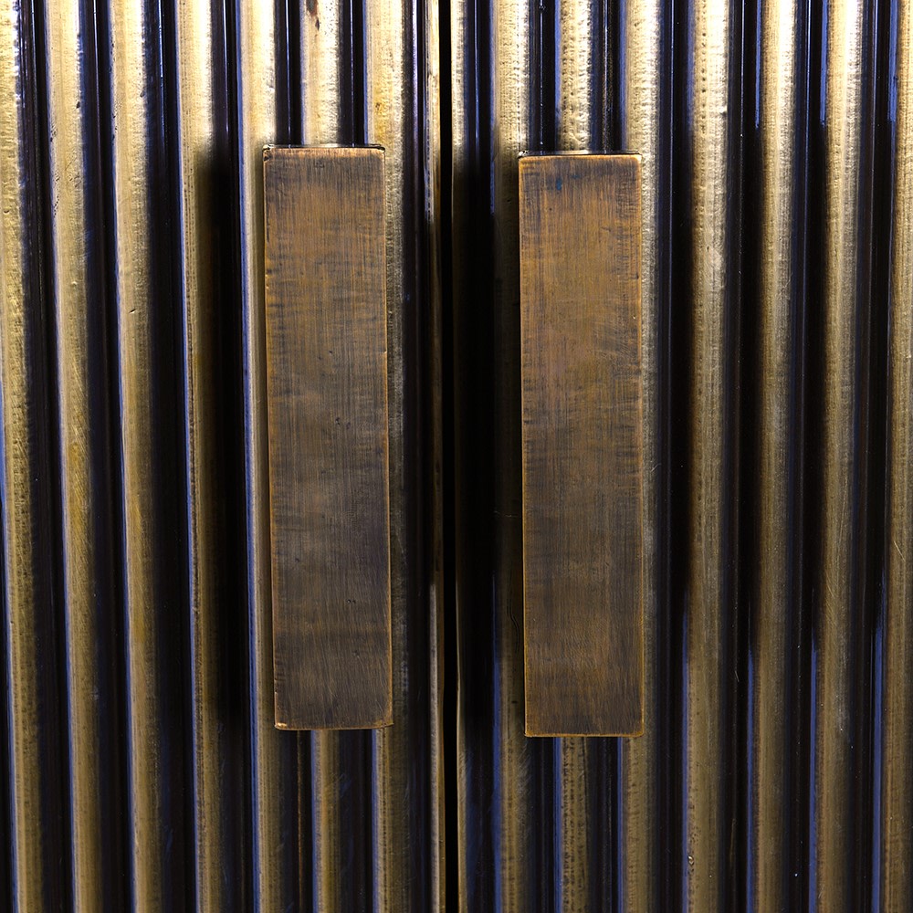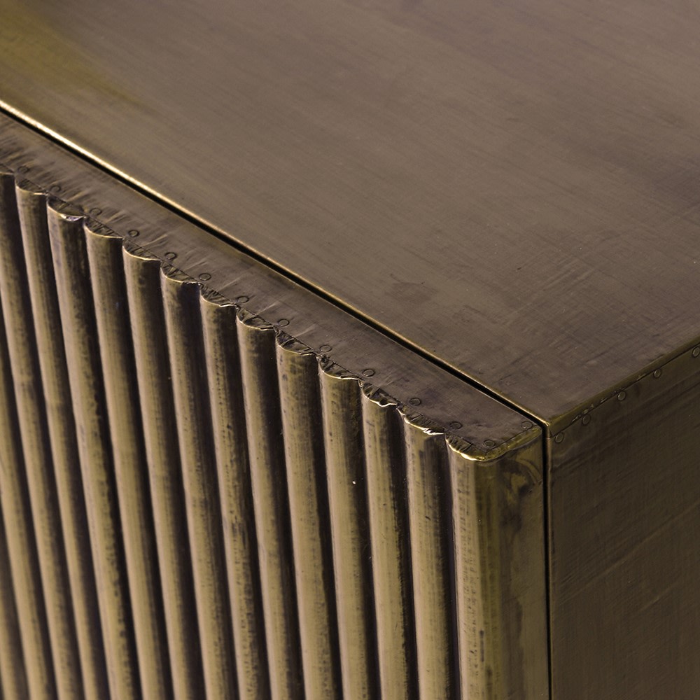 This Antique Brass Ribbed 4 Door Sideboard combines timeless elegance with practical storage. Featuring a slight distressed finish, it brings a aged charm while the ribbed detailing adds refined texture. Designed with four spacious doors, it offers ample room to organize essentials, making it ideal for living or dining spaces that appreciate classic craftsmanship and distinctive character.