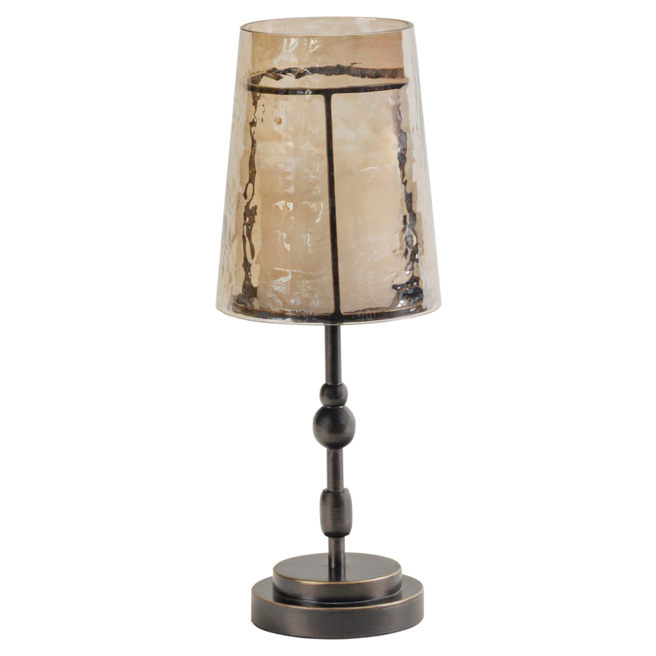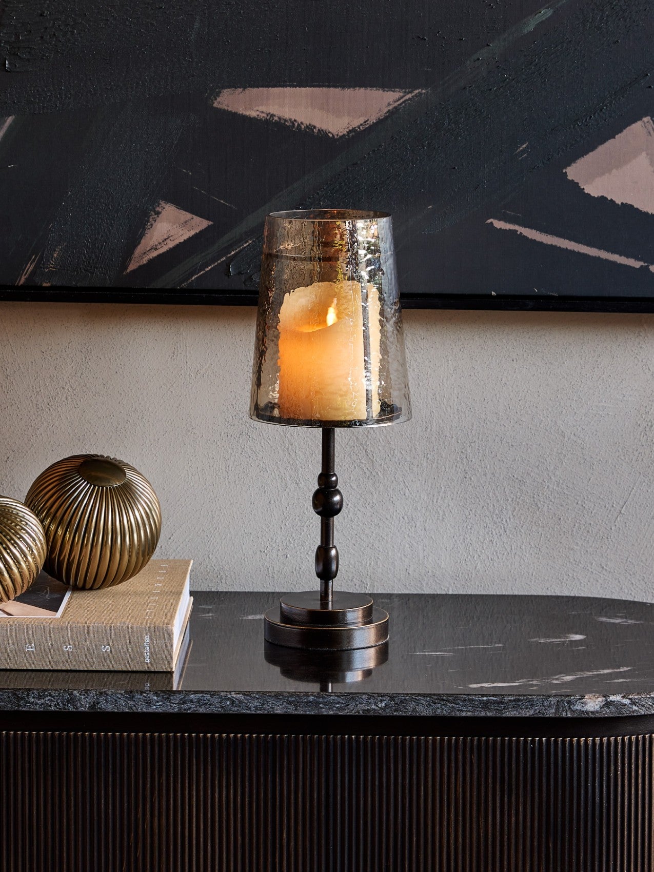 Elevate your table setting with this striking Dark Bronze & Glass Table Hurricane. The robust bronze column base ensures stability and adds timeless elegance to any décor scheme. Perfect for dining tables, mantels, or accent displays, this decorative piece combines functional illumination with refined aesthetics. Candle not included.