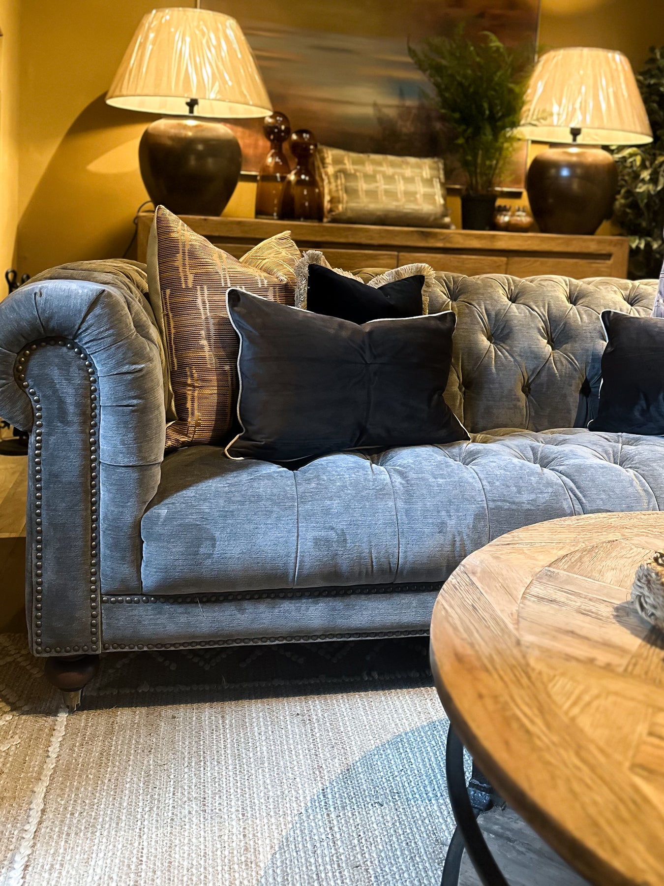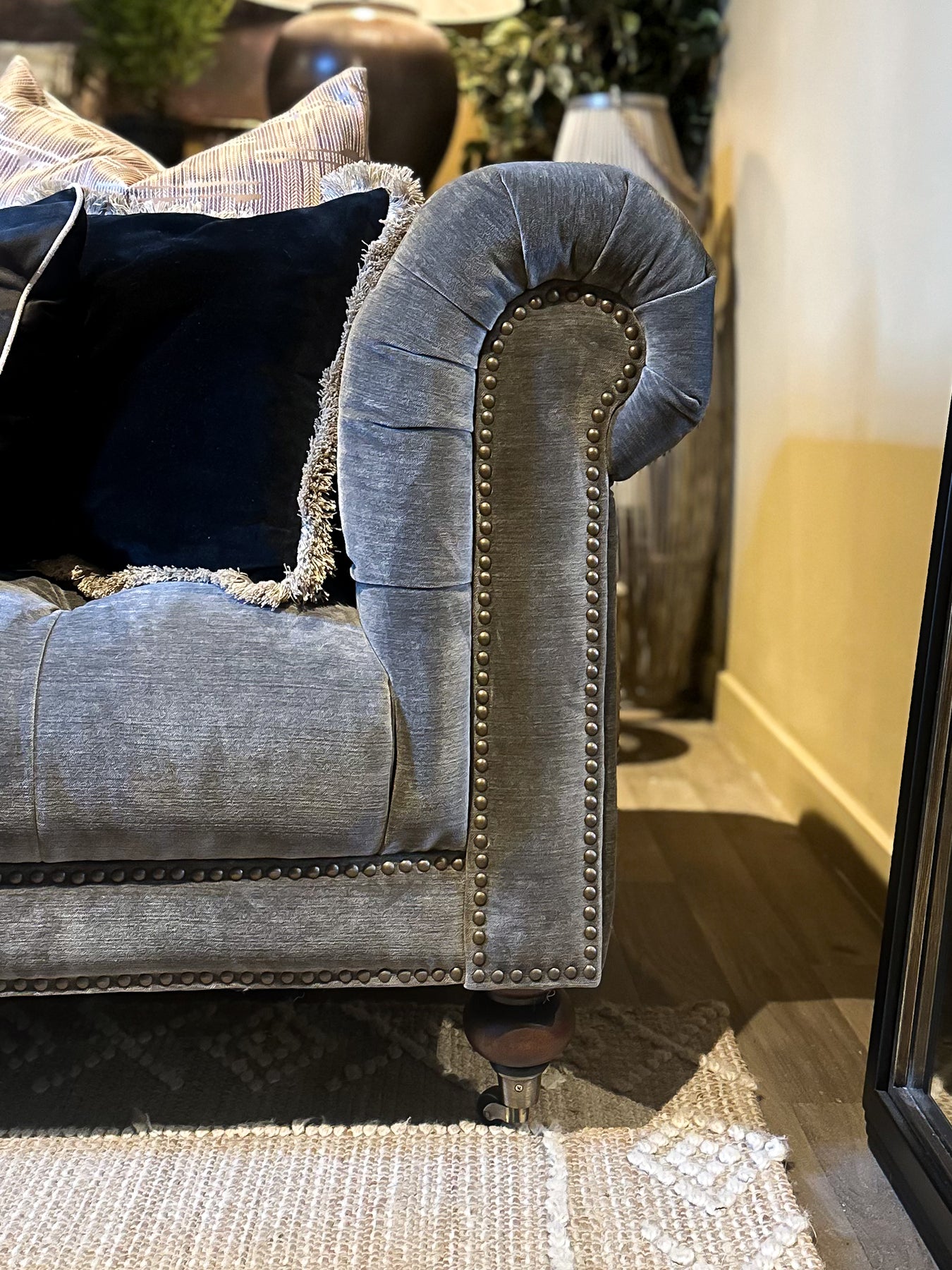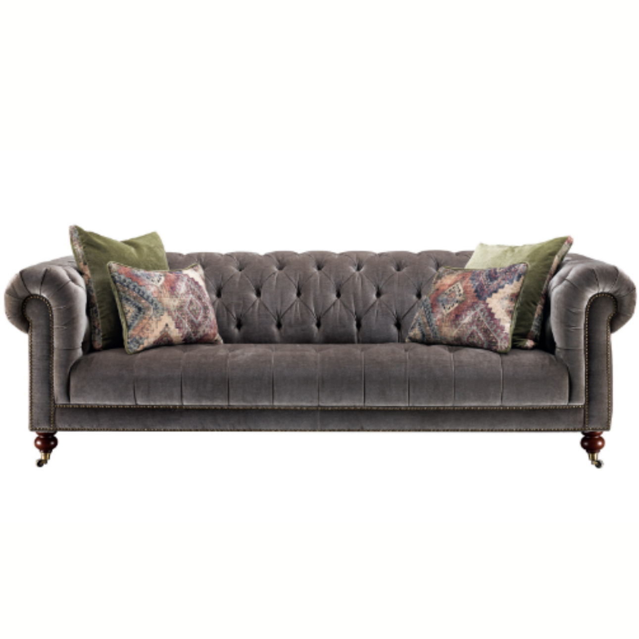 The Knightley 3.5 Seater Sofa combines timeless Chesterfield styling with refined craftsmanship. Hand-turned hardwood feet provide sturdy support and authentic period detailing, whilst double-tied buttons create the signature deep-buttoned upholstery characteristic of this classic design. Gracefully curved scroll arms offer generous seating comfort across the expansive frame. A sophisticated choice for those seeking enduring elegance and substantial seating capacity.