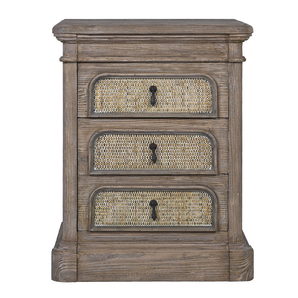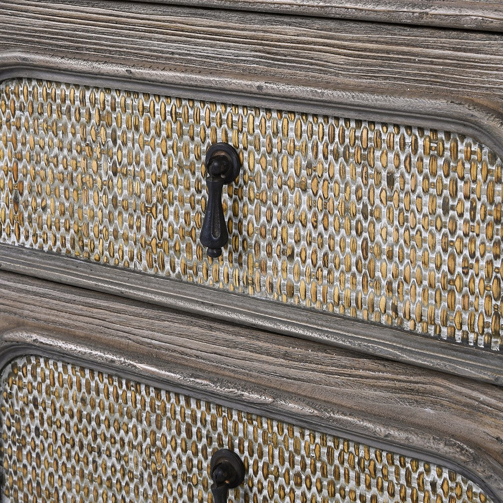 The Pine & Rattan 3 Drawer Bedside table combines rustic charm with practical design. Crafted from natural pine wood and complemented by woven rattan panels, it offers sturdy storage with three spacious drawers.