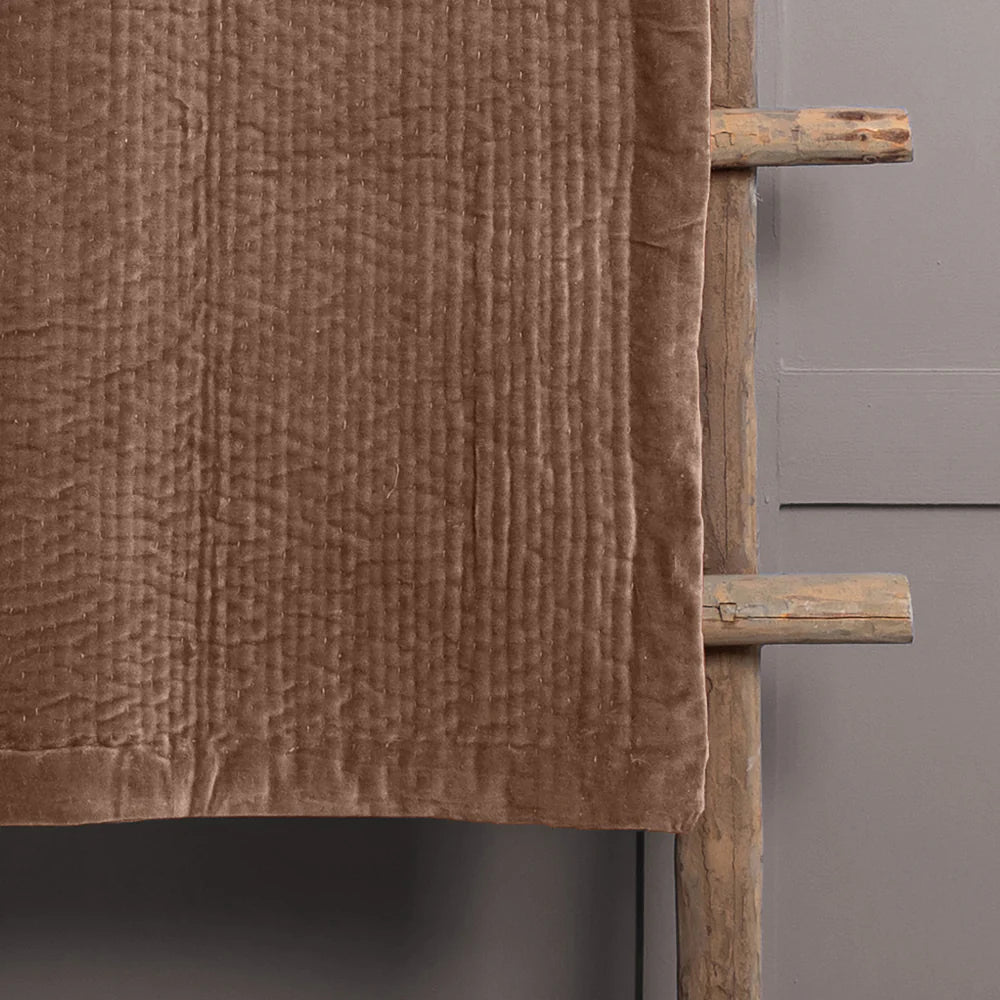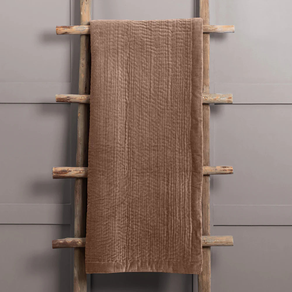 Crafted from sumptuous coral velvet, this quilted throw combines tactile luxury with practical warmth.