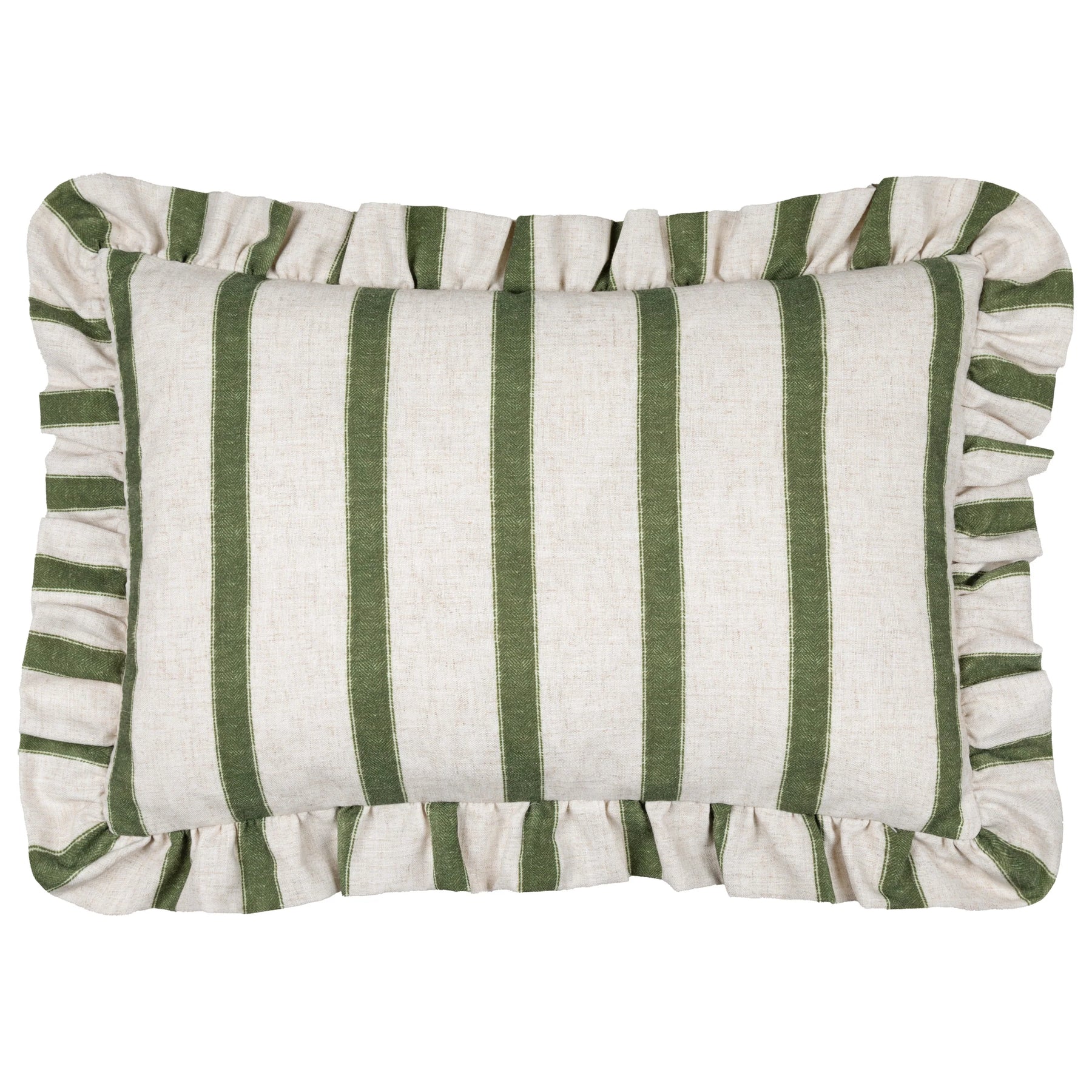 Elevate your interior with this sophisticated striped moss ruffle cushion, expertly crafted to add textural depth and visual interest to any seating arrangement. The delicate ruffled edging creates an elegant focal point, while the muted moss tones complement both contemporary and traditional décor schemes.