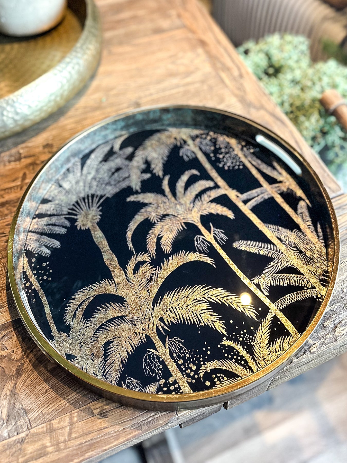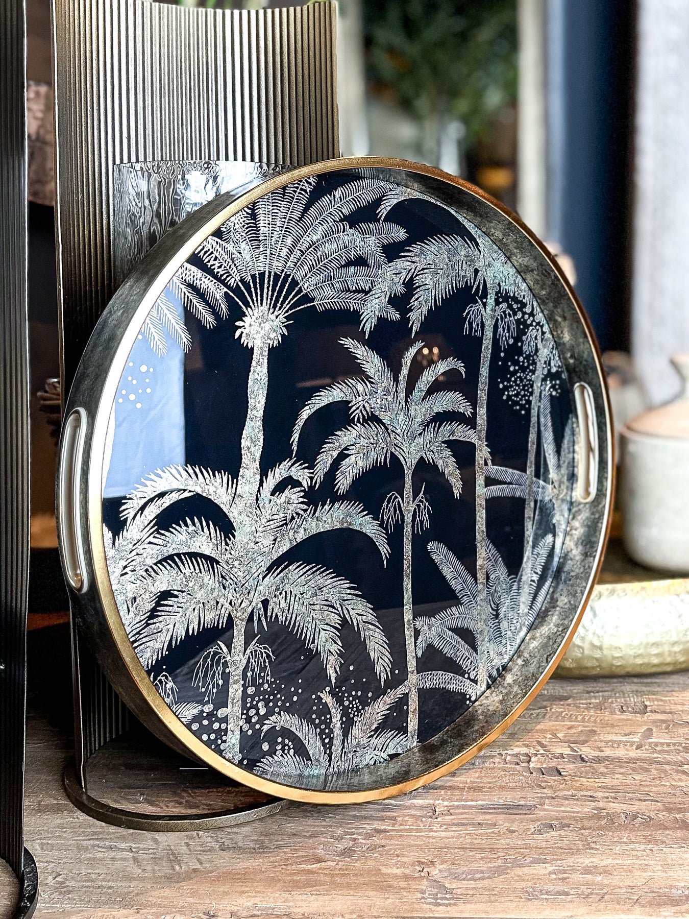 This luxury accessory is sure to make a statement in your home. Perfect for serving cocktails when entertaining guests as well as sitting proudly on your coffee table when not in use. Featuring an antiqued style gold rim with a black and gold palm print across the base of this stunning tray.