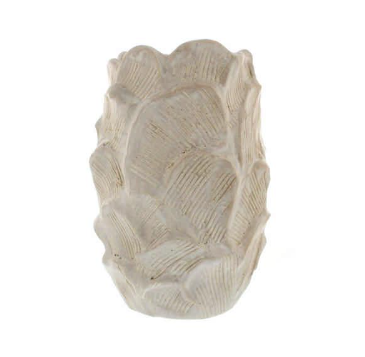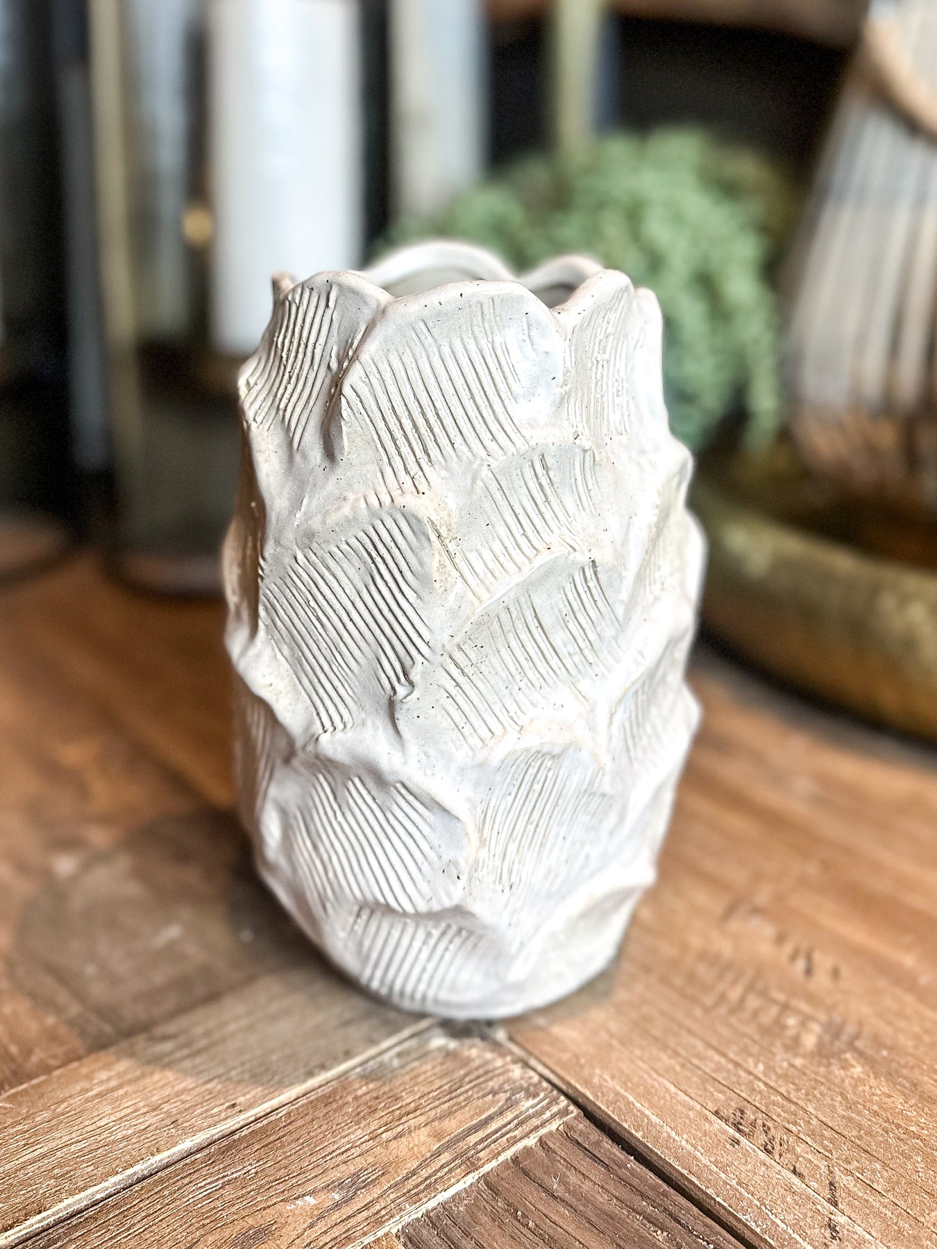 This elegant cream vase features an intricate leaf pattern that brings natural sophistication to any interior space. Standing at 21cm, it's perfectly proportioned for tabletops, shelving, or as a striking centrepiece.