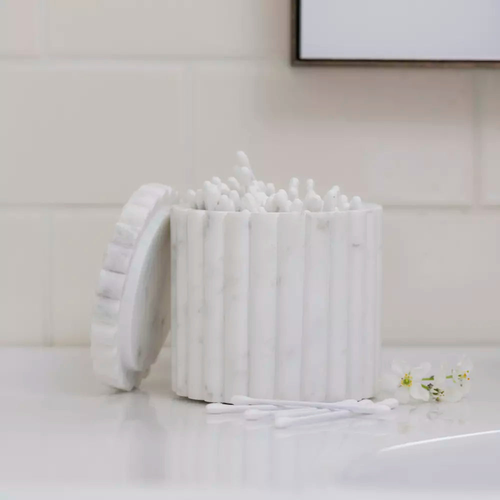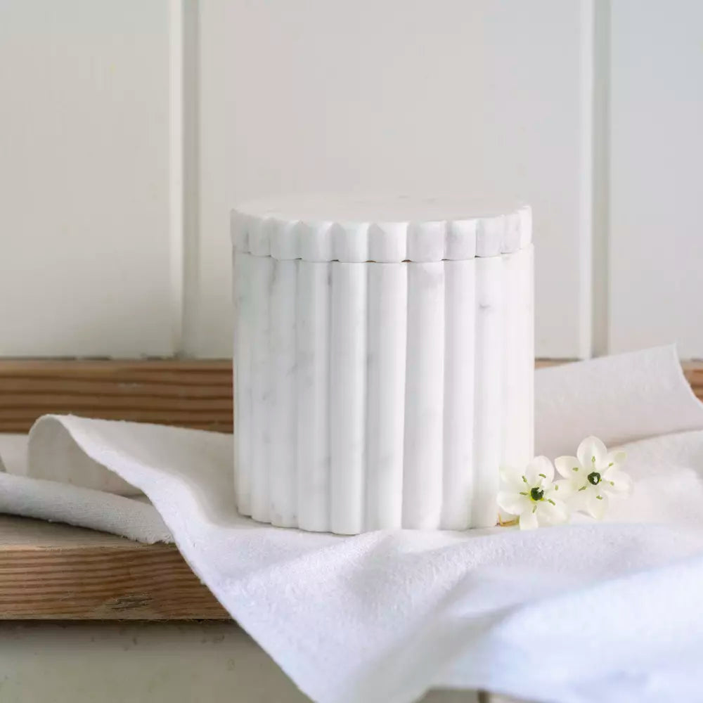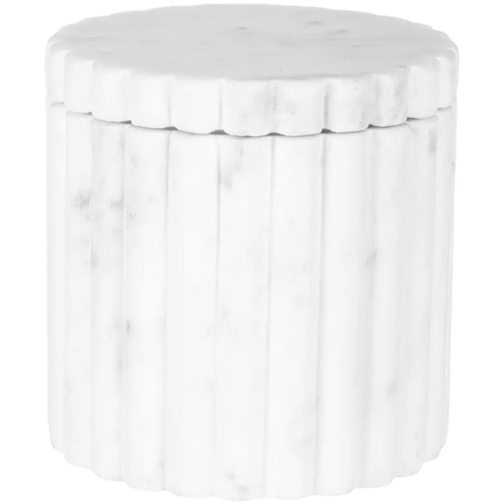 Crafted from premium white marble with distinctive ribbed detailing, this lidded vessel adds a sophisticated touch to your décor.