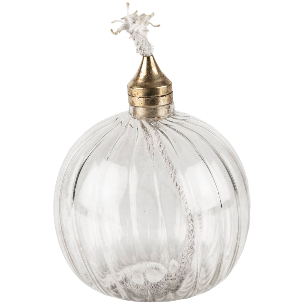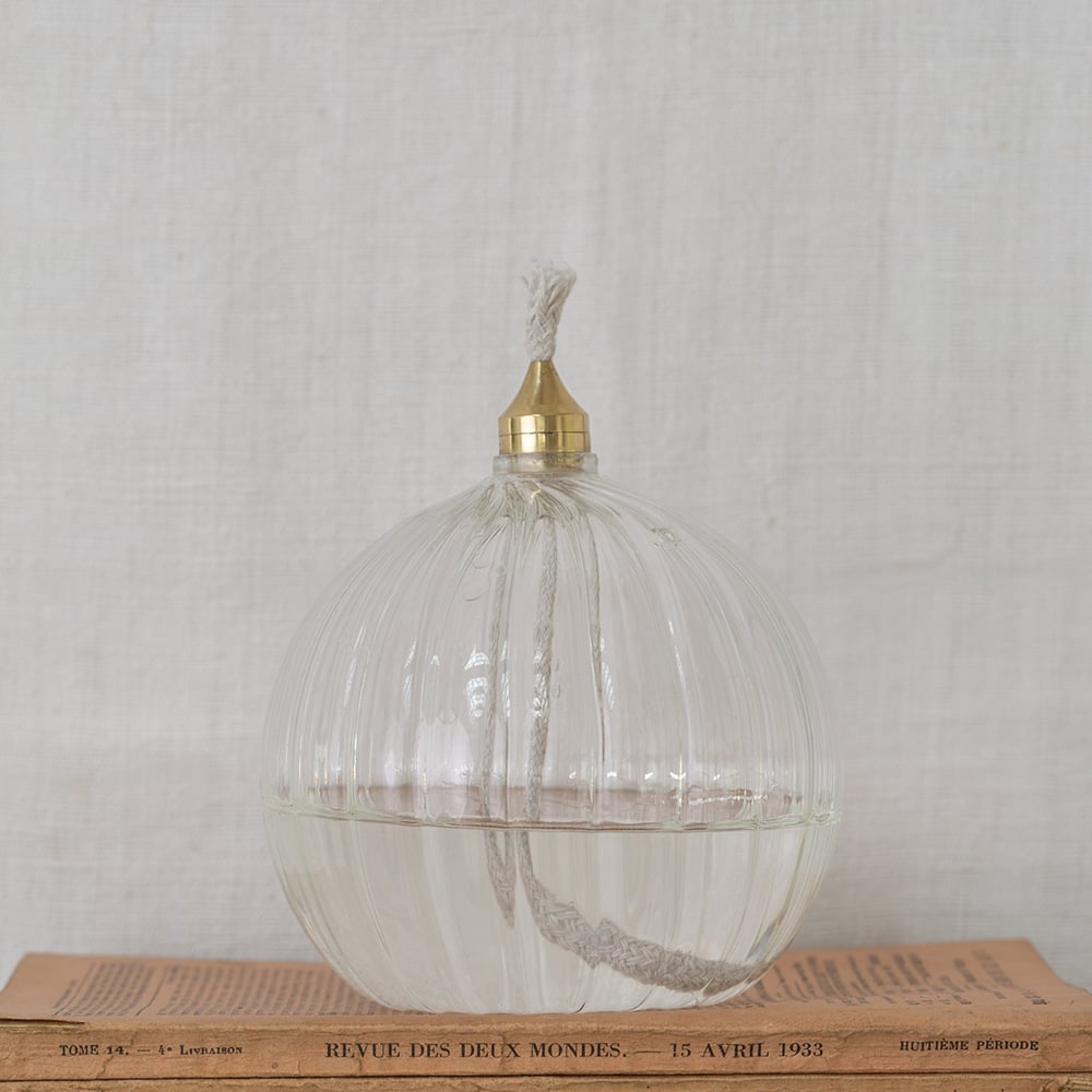 The Thea Oil Lamp features a compact, round glass design that combines elegance with functionality.